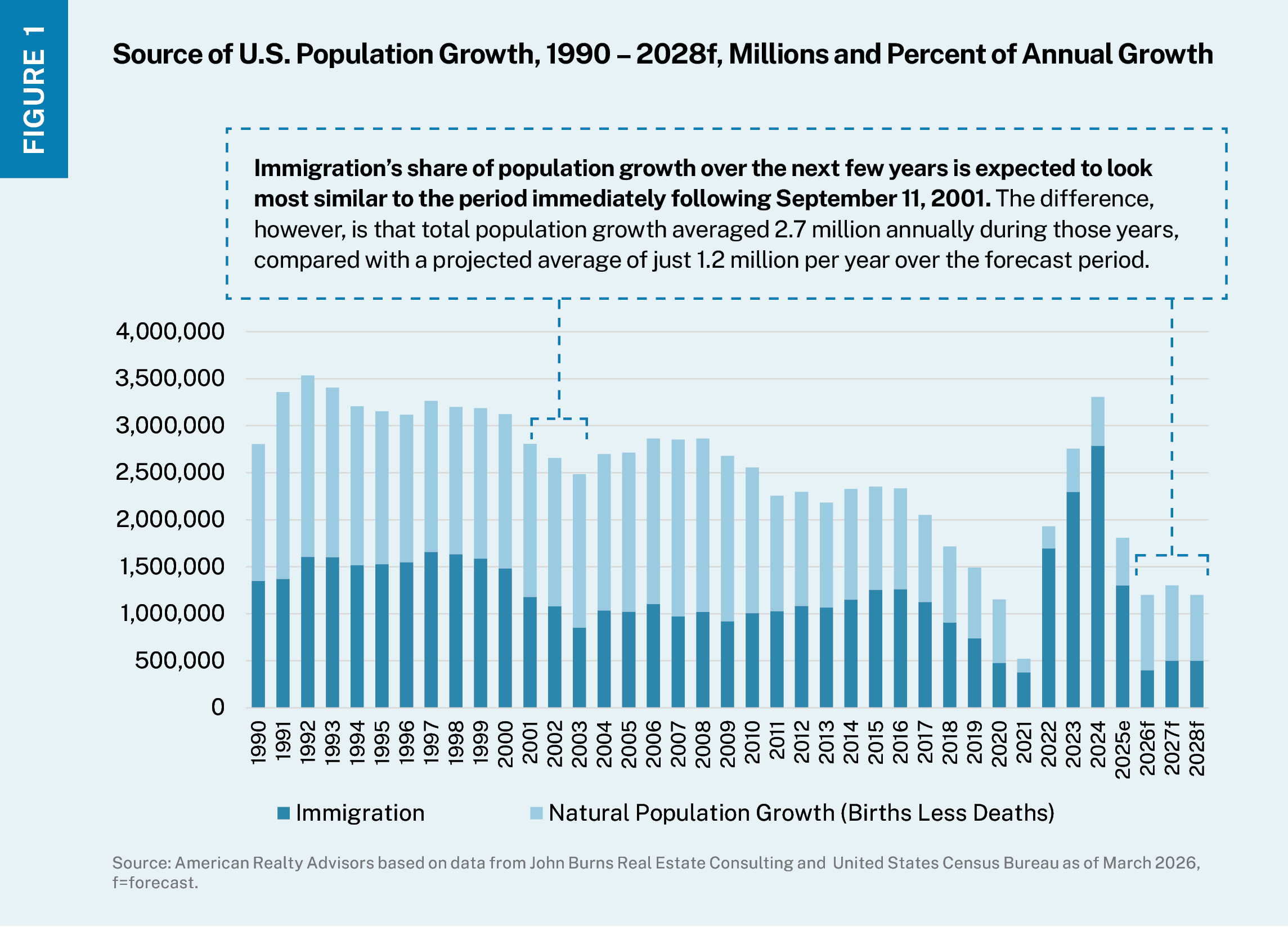 Natural population growth has slowed materially over the past decade as Americans are having fewer children and the Baby Boomer generation ages. In turn, immigration has increasingly accounted for more of overall population growth. Between 2010 and 2020, immigration represented just under half (45%) of overall population change in the U.S., increasing even more dramatically during the years following the pandemic. Between 2022 and 2024, immigration accounted for more than 80% of net population growth (Figure 1). Without immigration in that period, overall population growth would have been minimal.