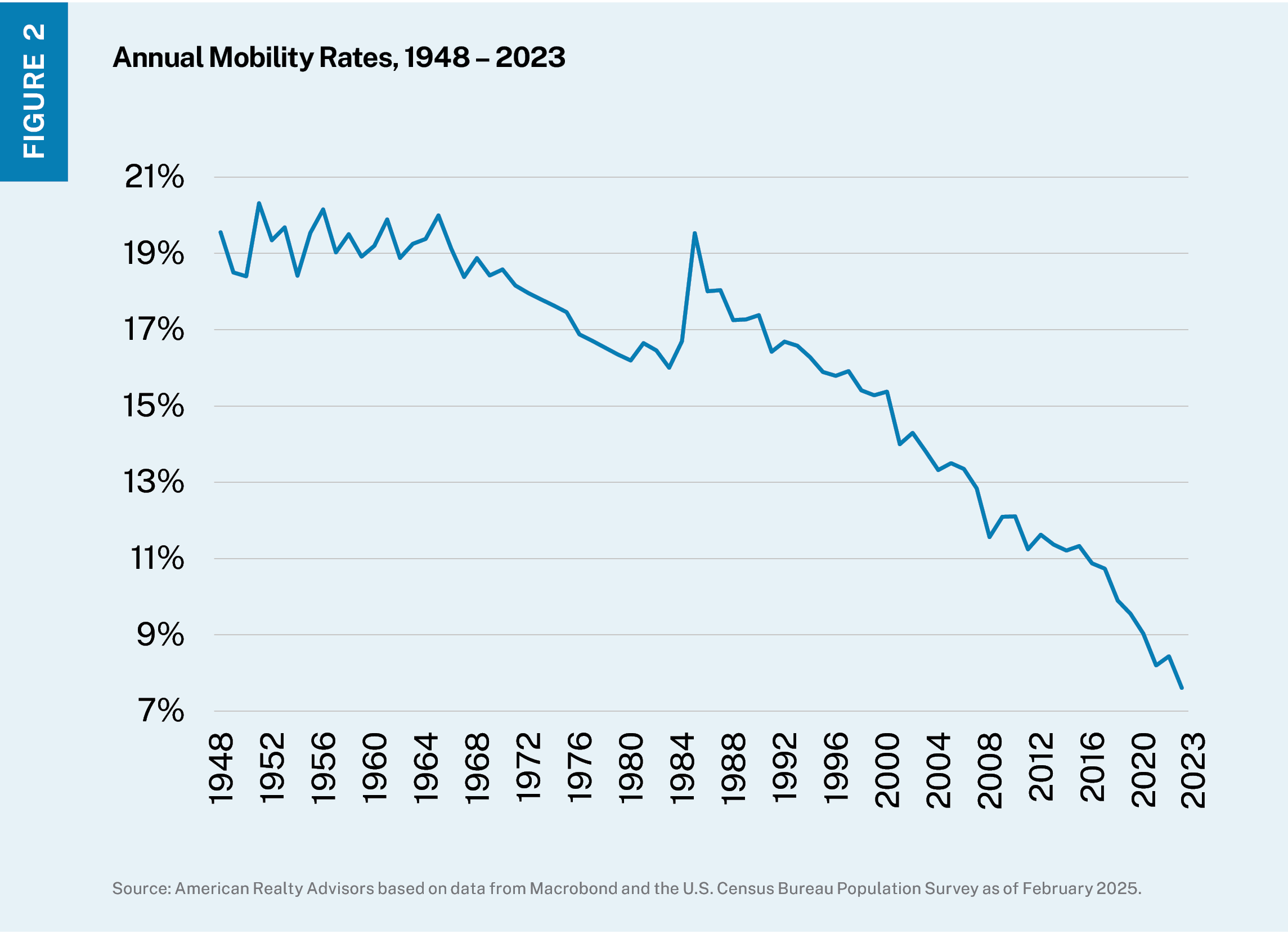 It is tempting to assume that if immigration slows, domestic migration will simply pick up the slack – that job growth will pull renters across state lines and keep demand humming. However, domestic mobility has been declining for decades (Figure 2). Fewer households are moving across state lines than in prior cycles, meaning the overall flow of movers is thinner. For multifamily owners, that means fewer renter households arriving from other states to backfill new deliveries.