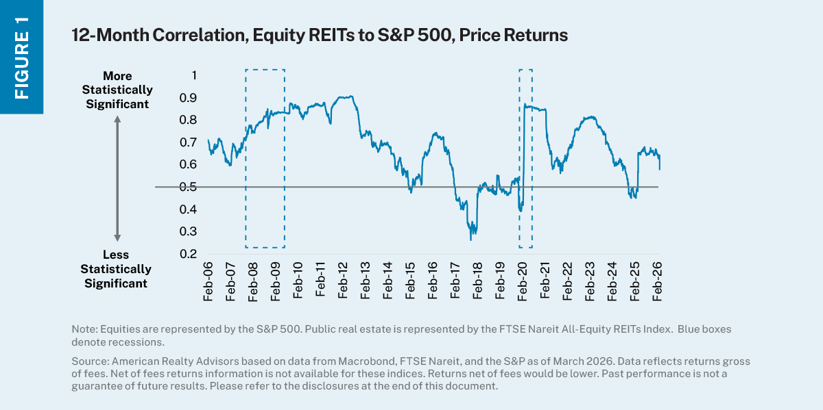 • Equity market correlation: Over the short term, REITs behave more similarly to the broader stock market than the real estate itself, which can lessen diversification benefits. During periods of market stress, REIT correlations to the S&P 500 have historically spiked, reducing diversification benefits precisely when they are needed most (see Figure 1).
