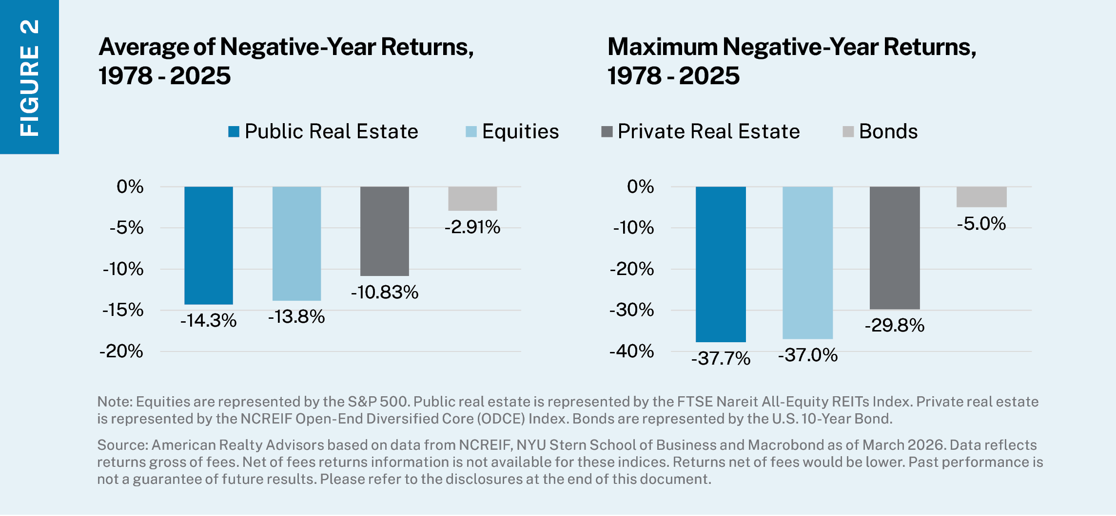 • Lesser downside: Compared to public REITs, private real estate’s average and maximum negative-year returns going all the way back to 1978 show private real estate offers compelling relative downside protection (see Figure 2).