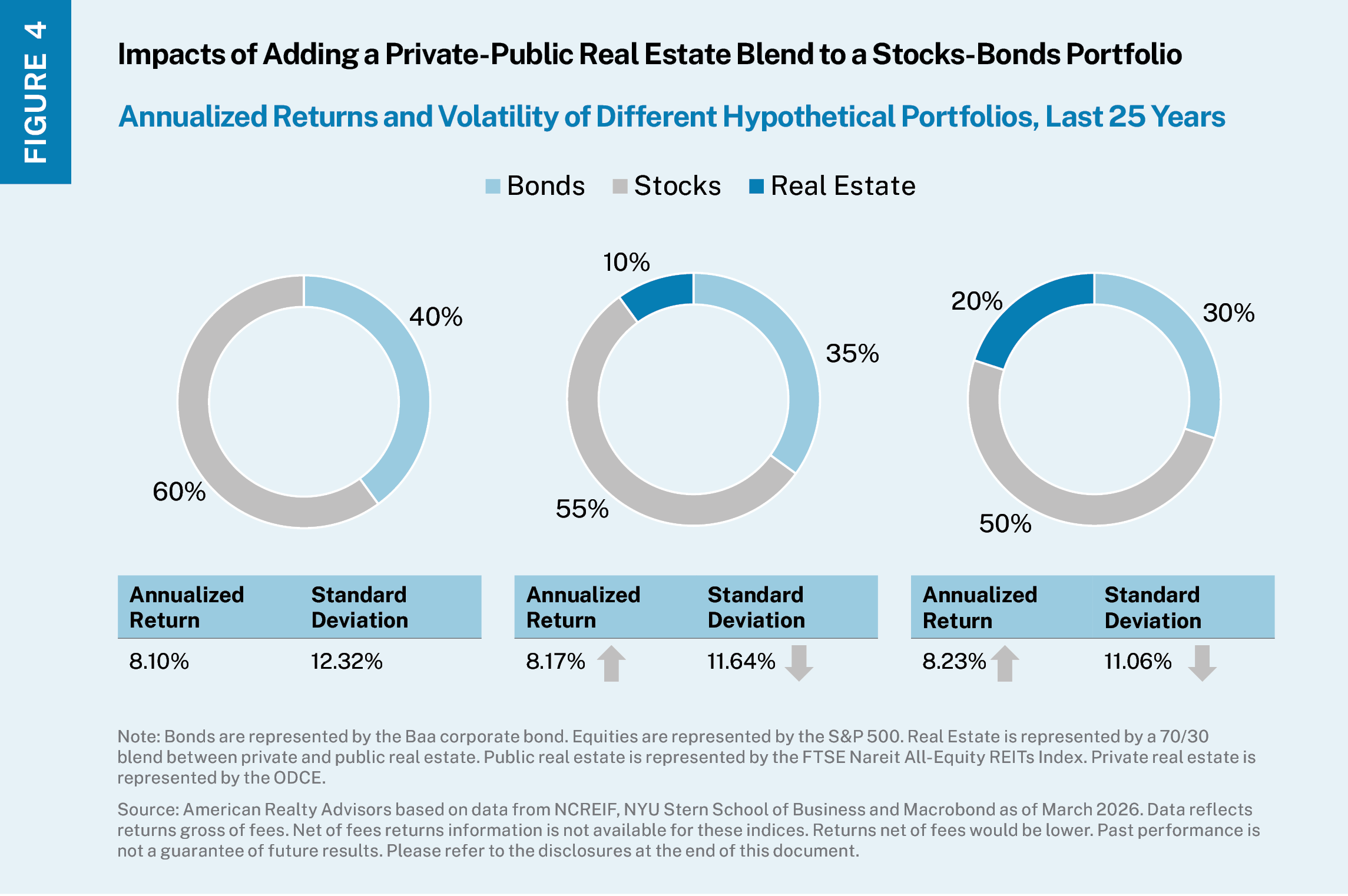 For most institutional allocators, the question is generally not private real estate or REITs, but rather how to size the two within a broader portfolio context. We believe a reasonable framework is to use private real estate as the anchor, adding the “truest” real estate exposure and gaining the income, diversification, inflation protection and downside mitigant, and then leveraging REITs as the liquid sleeve of the broader real estate allocation. The data suggests adding 10 to 20% real estate to a stocks-bonds portfolio enhances returns and lowers volatility, with the real estate being a 70/30 blend of private and public (see Figure 4).